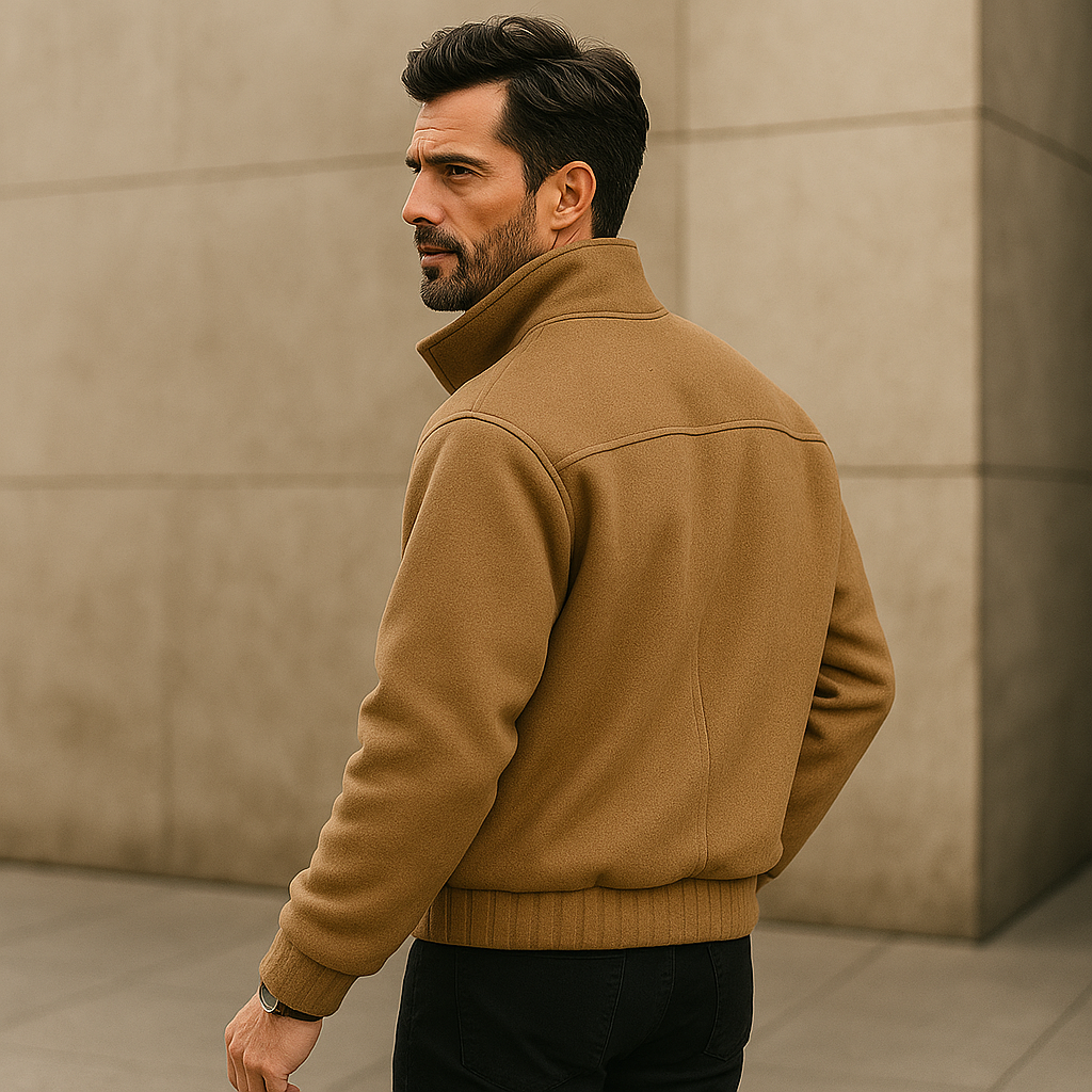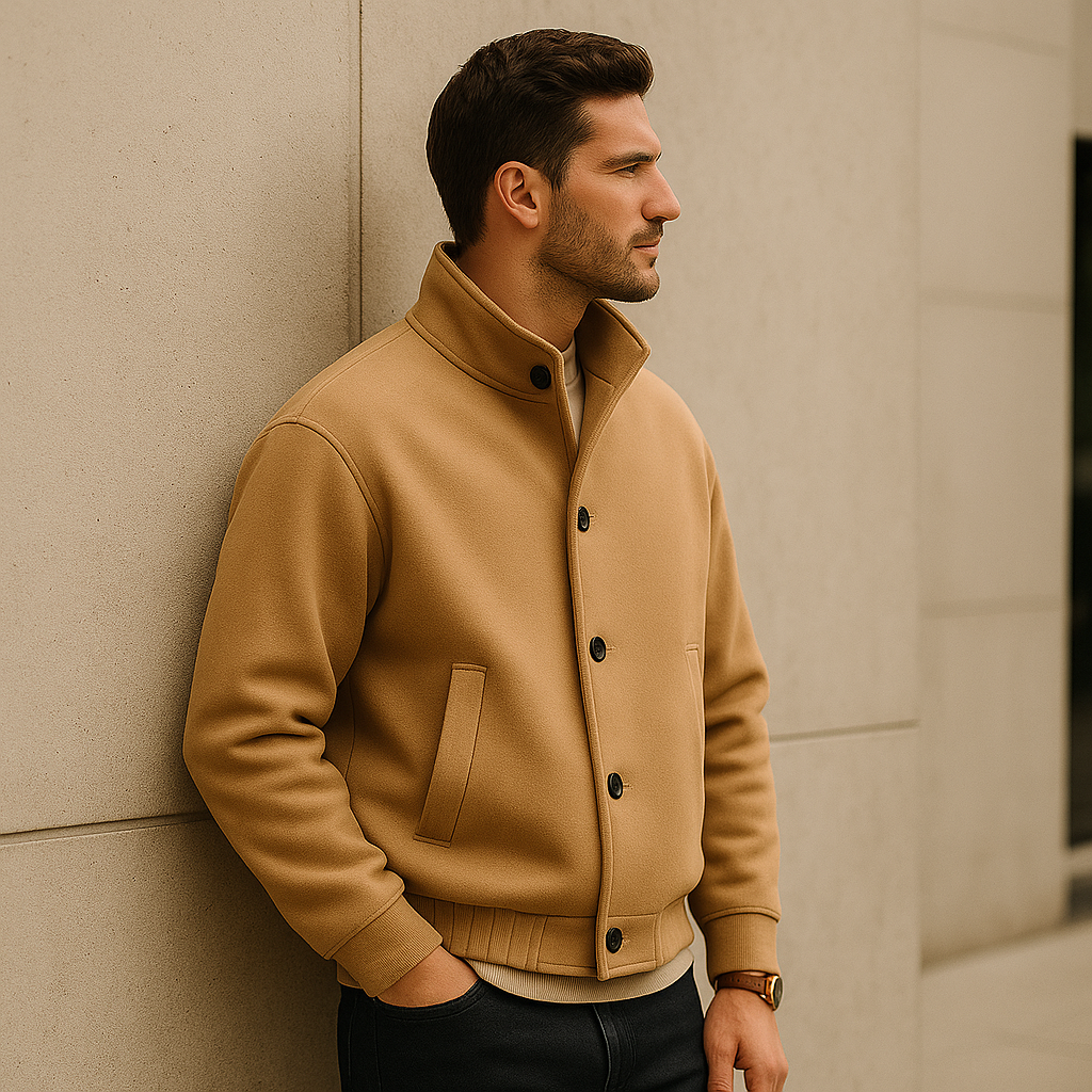 Tato pánská bunda kombinuje měkkou a strukturovanou látku s volným střihem pro maximální pohodlí. Vysoký límec a zapínání na knoflíky dodávají elegantní a sofistikovaný vzhled. Ideální pro vrstvení a všestranné použití od podzimu do jara.