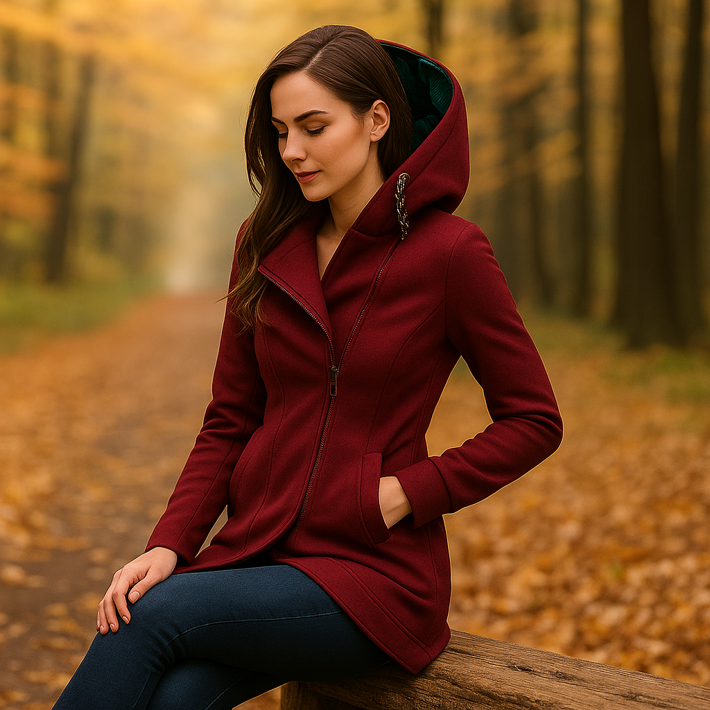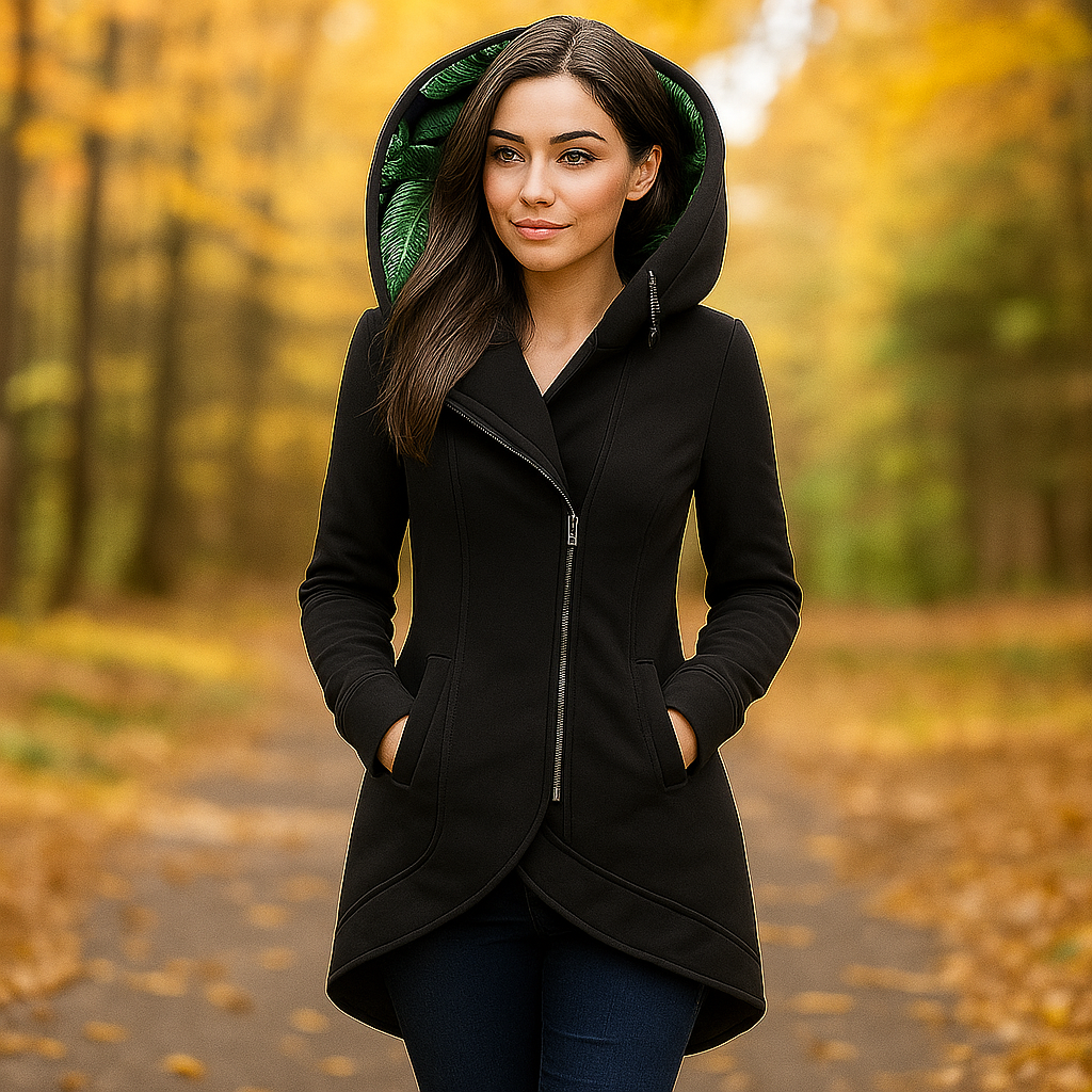 בד : בד חם ורך קפוצ׳ון : רחב, עם בטנת דוגמת עלים סגירה : רוכסן מודרני בצורת איקס כיסים : צדדיים נוחים גזרה : מחמיאה ומותאמת