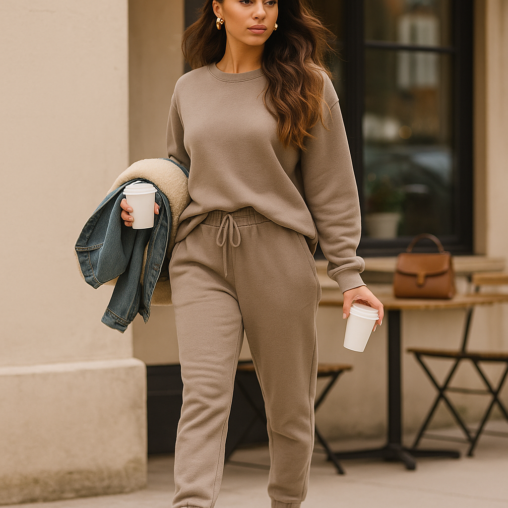חליפת הספורט EzraH משלבת נוחות וסגנון מודרני. חומרים רכים ונושמים מספקים חום ללא התחממות יתר. הסווטשירט עם הקפוצ'ון והמכנסיים הצמודים מבטיחים פונקציונליות ומראה אופנתי.