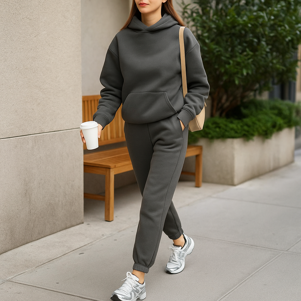 Urban Jogger - הסדרה לנשים משלבת סגנון, נוחות ופונקציונליות, מושלמת לשימוש יומיומי ופעילויות. הכותנה הרכה והנושמת עם אלסטאן מציעה חופש תנועה ותחושה מפנקת על העור. קפוצ'ון מתכוונן, כיס קנגורו ומותן אלסטית עם כיסים הופכים את הסדרה לנוחה ורב-תכליתית.
